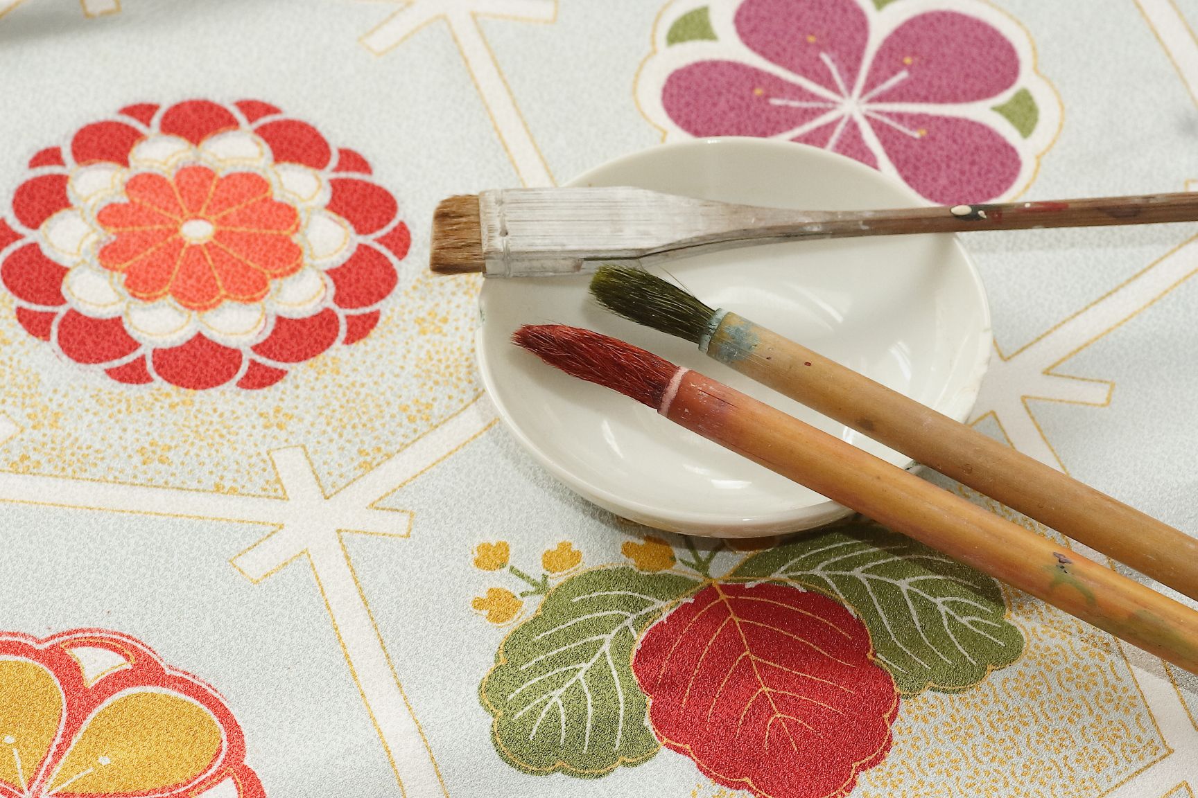 体験コースには、入門コース(1~1.5時間、1,300円~)や本格コース(3~5時間、21,000円~)があり、型紙とハケを使う“摺込友禅”を体験できます。