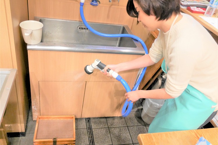 水槽に沈殿している和紙の素を浮き上がらせます。
