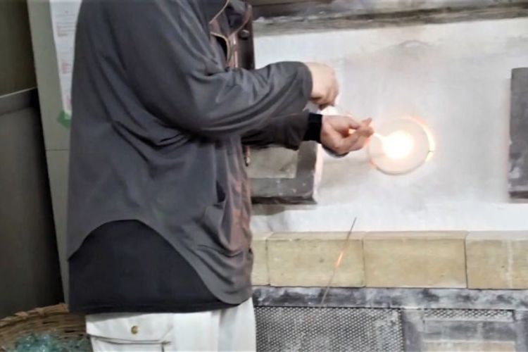 再度釜で熱し、最後に強く吹いて膨らませて完成になります。