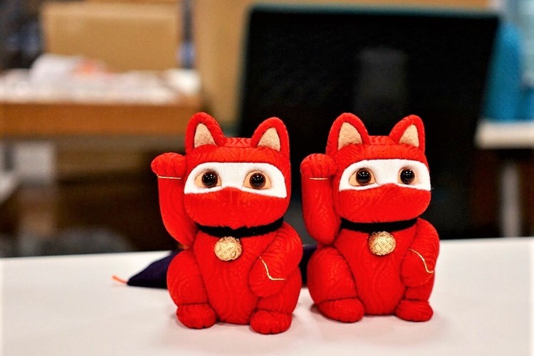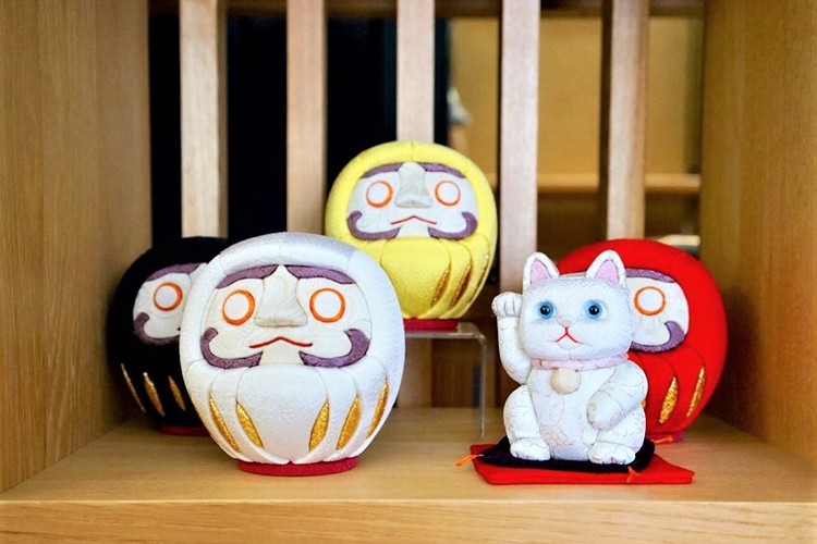 画像の招き猫はTokyoTokyoとのコラボ商品で、京友禅で生地から染めて使っている。
