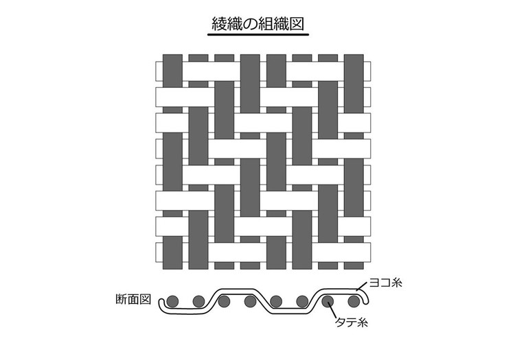 綾織は、斜文織とも呼ばれ、経糸と緯糸の交差する点がななめに連続して織られる技法です。