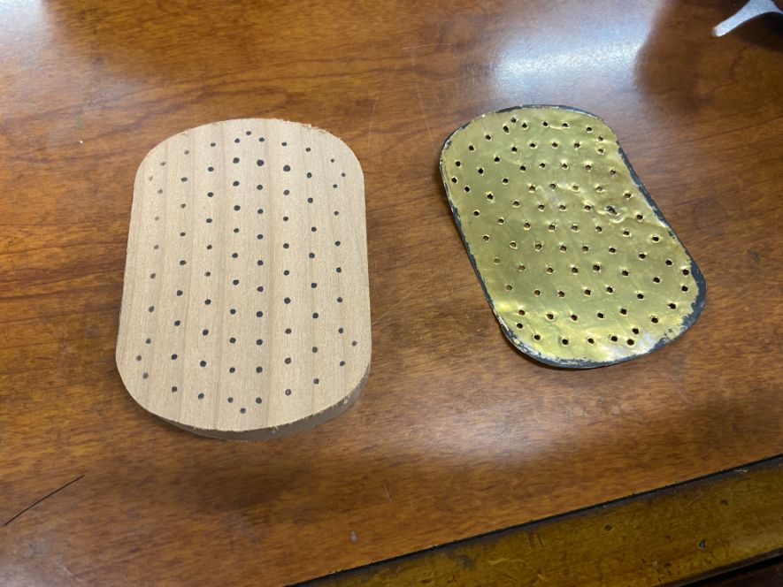 穴の空いた手作りの金型を木地の上に置き、上から墨をこすって、穴を空ける位置に印をつけていきます。