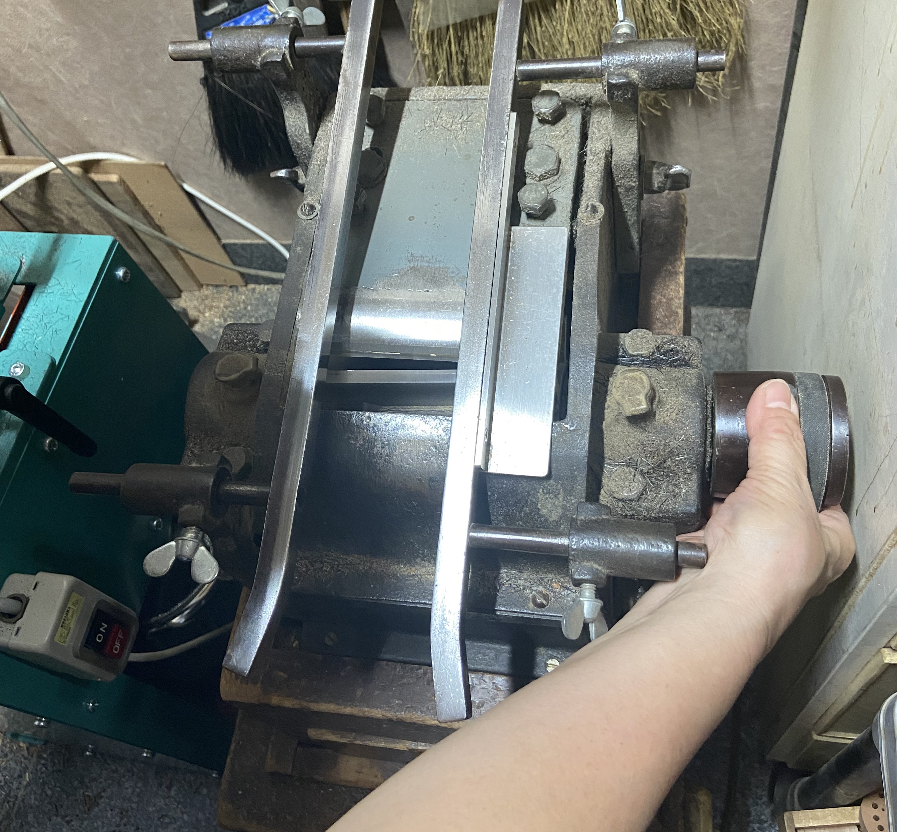 すべての穴に毛を通し終えたら、凸凹と盛り上がったワイヤーを平らにするため、ブラシの背と台の間に円柱状の鉄棒を挟んでブラシをゴロゴロと転がしていきます。