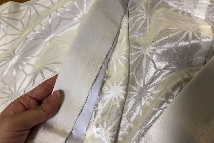仕立て上り(既製品)で売られているものは、はじめから白い塩瀬の半襟が縫いつけられていて、そのまま着られることも多いですが、好みの色や柄の半襟を使いたいときは事前に縫っておく必要があります。