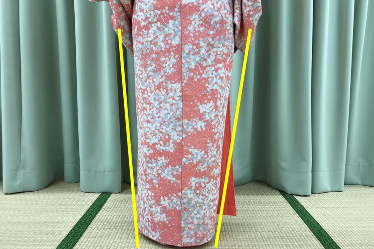 左右の身頃の合わせ方は、上前のおくみ線(打ち合わせ部分)が右足の小指の位置に来るように。