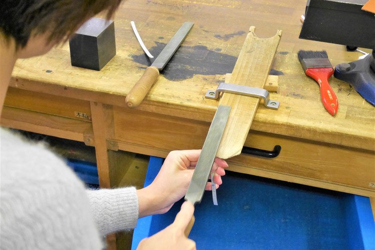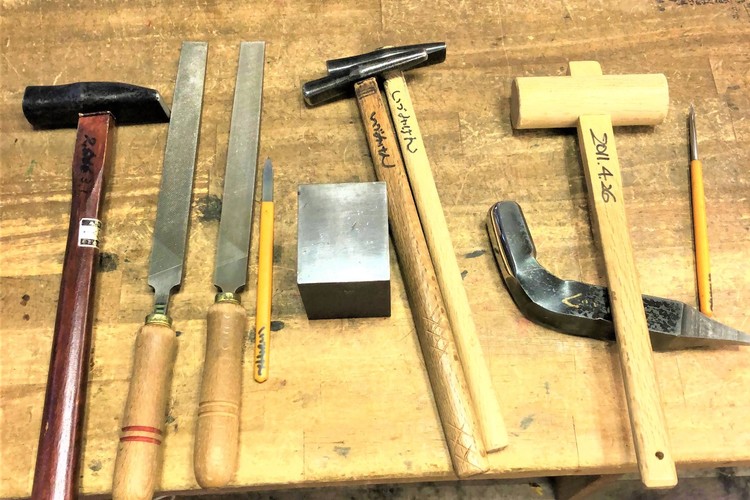 数種類のヤスリやトンカチ、オレンジの持ち手の「キサゲ」という聞きなれない工具も使っていきます。