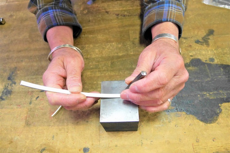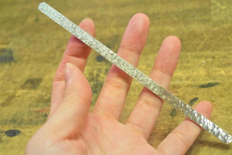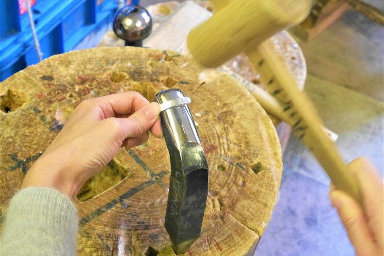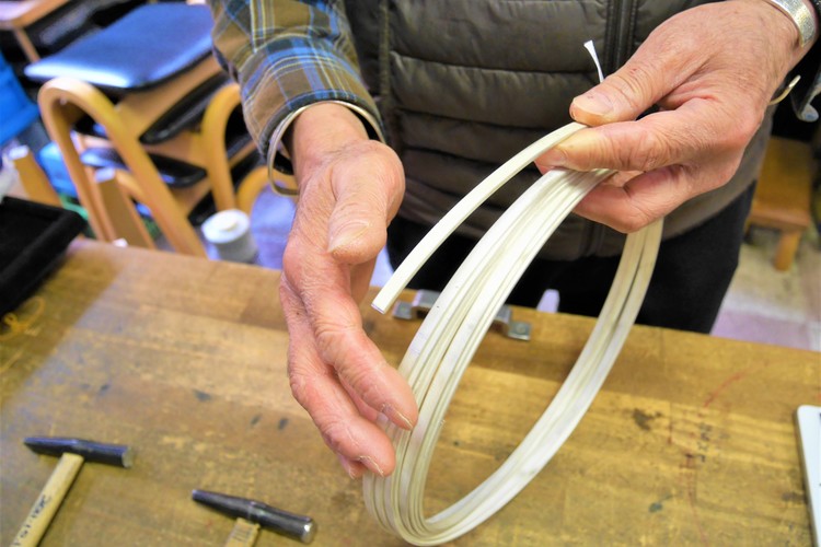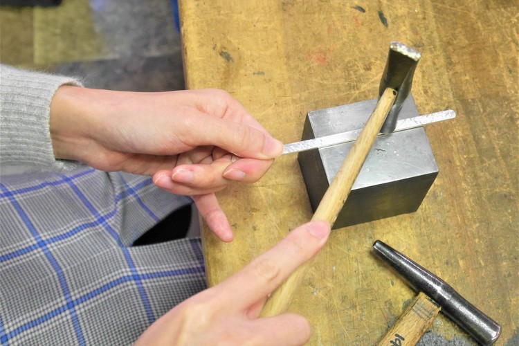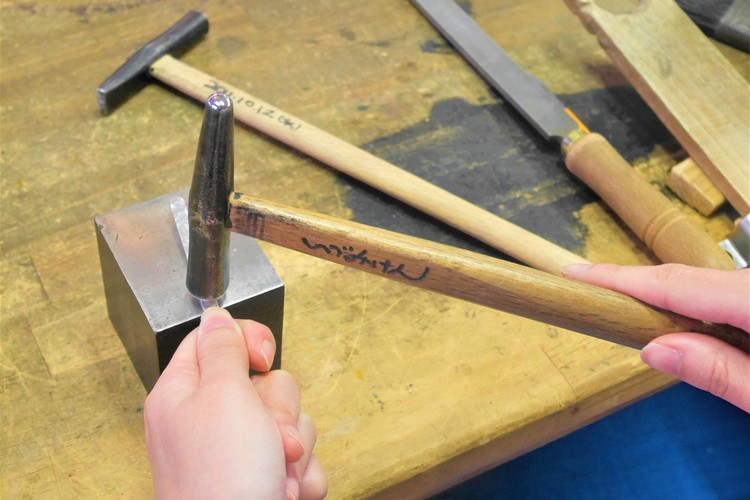 銀の板の両端を木のトンカチで叩いて丸めます。