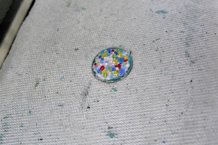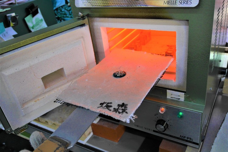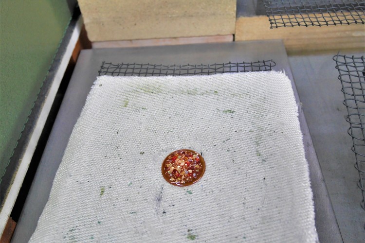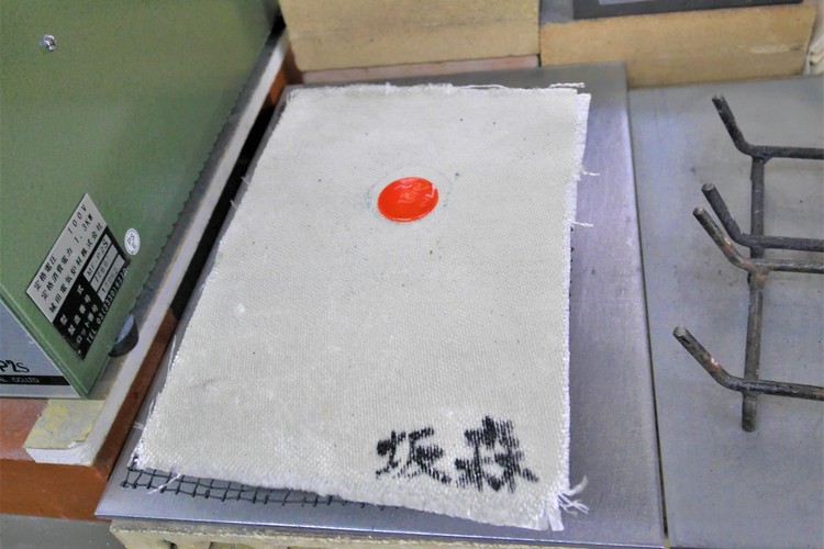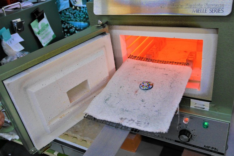 焼けた後にフリットと呼ばれる色付きガラスを乗せていきます。