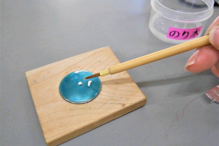 ベースの上に銀箔を乗せ、筆にのり水を含ませて付けていきます。
