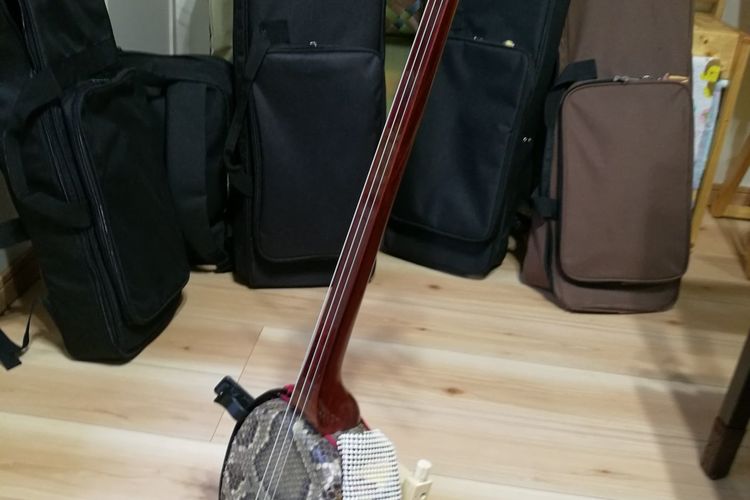 これは胴の部分が合皮張りになったもので、どうしても蛇皮のものとは音が違います。