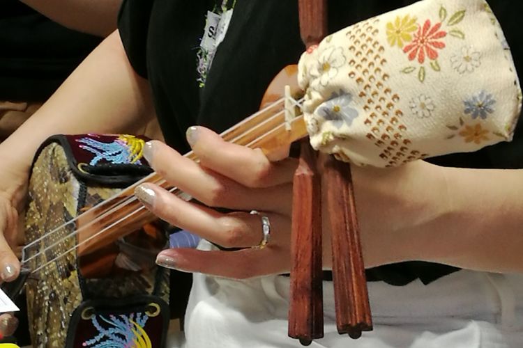 柄も短く胴も丸っこく、音色も三味線より太く、響きのあるものです。