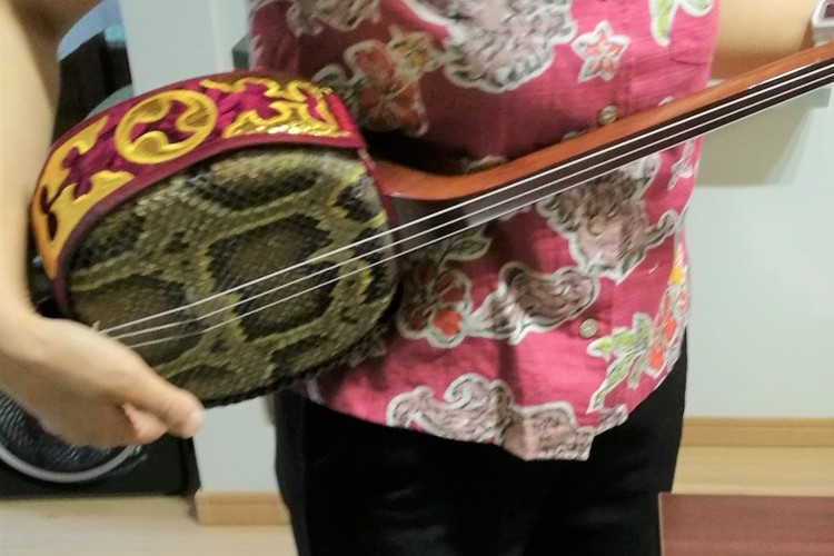 皮はインドニシキヘビの皮が使われていましたが、絶滅危惧種に指定されて以降は、ビルマニシキヘビが使用されています。