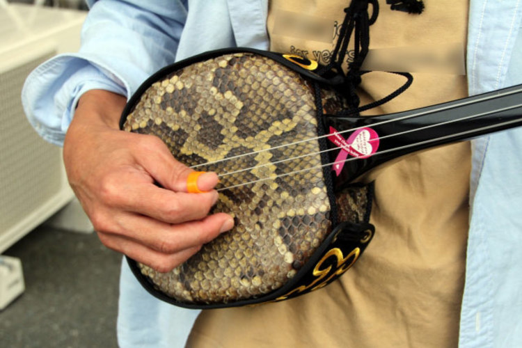 三線は胴に蛇の皮が張られており、水牛の角で作った爪ではじきながら演奏します。