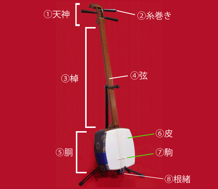 ここでおおまかにですが、三味線の部位名称について押さえておきましょう。